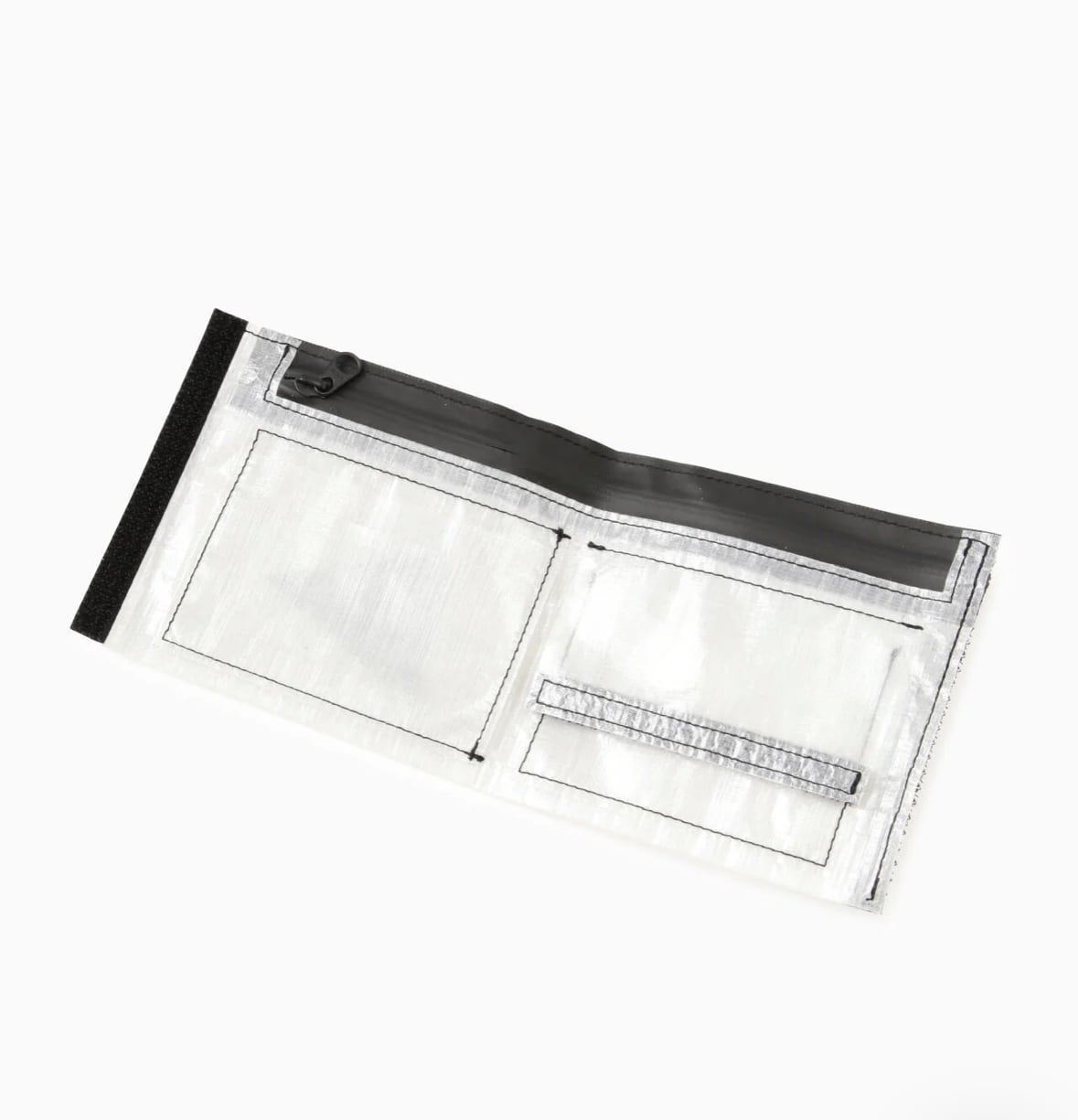 DSM社のダイニーマコンポジットファブリック(旧キューベン・ファイバー)を使用した財布です。ダイニーマ繊維をUV樹脂でラミネートした極薄のフィルム状のダイニーマコンポジットファブリックは、レーシングボート用の高機能セイルなどに使用されていて、超軽量で高い防水性と引裂強度があります。
