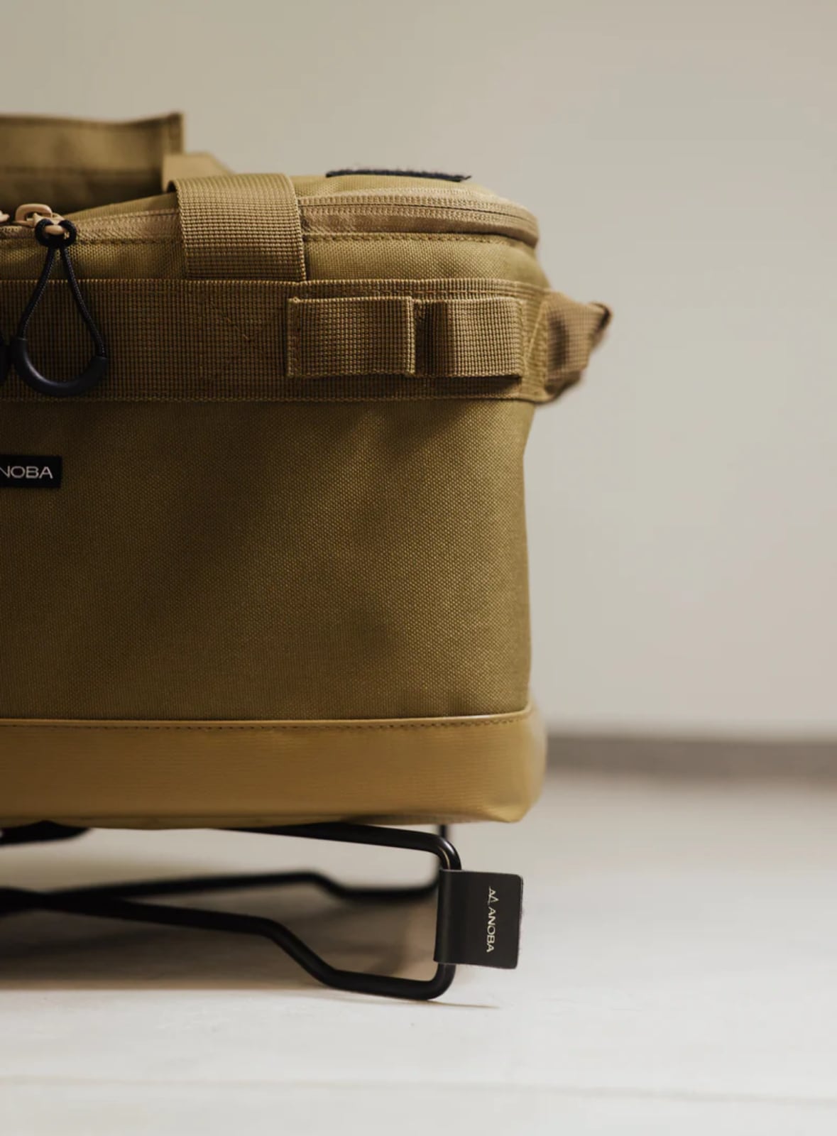 付属のアノバのロゴをあしらったロゴアタッチメントは、収納時はバンドとして使用可能です。