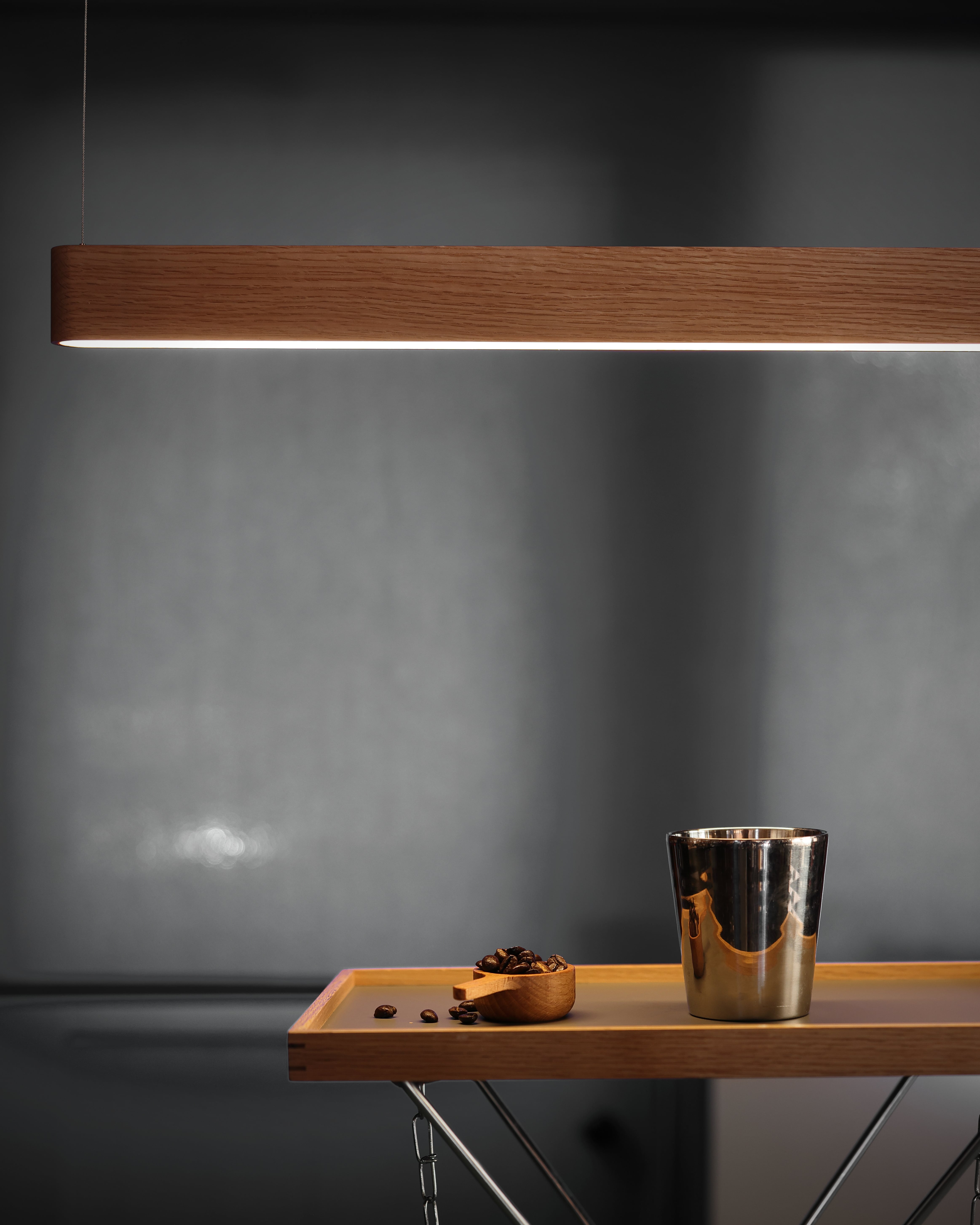 シンプルで直線的な意匠と温もりある素材は、
