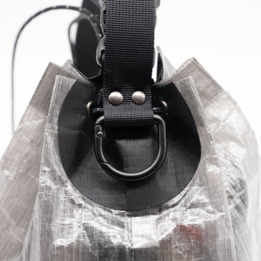 アウトドアらしいエッセンスであるワンアクションで開閉できるプラパーツを巾着部分に取り付けて、中へのアクセスを容易にしました。