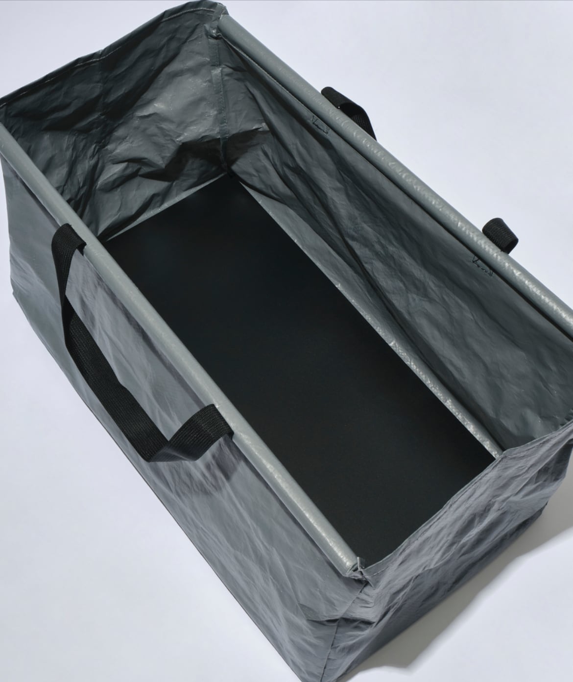 水源の森キャンプ・ランドの管理人が発案したポリエチレン素材のコスパバッグは、キャンプ場運営という現場仕事からのフィードバックと”キャンプ・ランド”ならではの持ち味が反映された注目の一作(だと思いません?)。大容量、グレーカラー、水に強いといったぱっと目を引くポイントはもちろんですが、サイドパネルのトップに仕込んだ木の芯棒がスタビライジング機能として持ち運び時に威力を発揮。