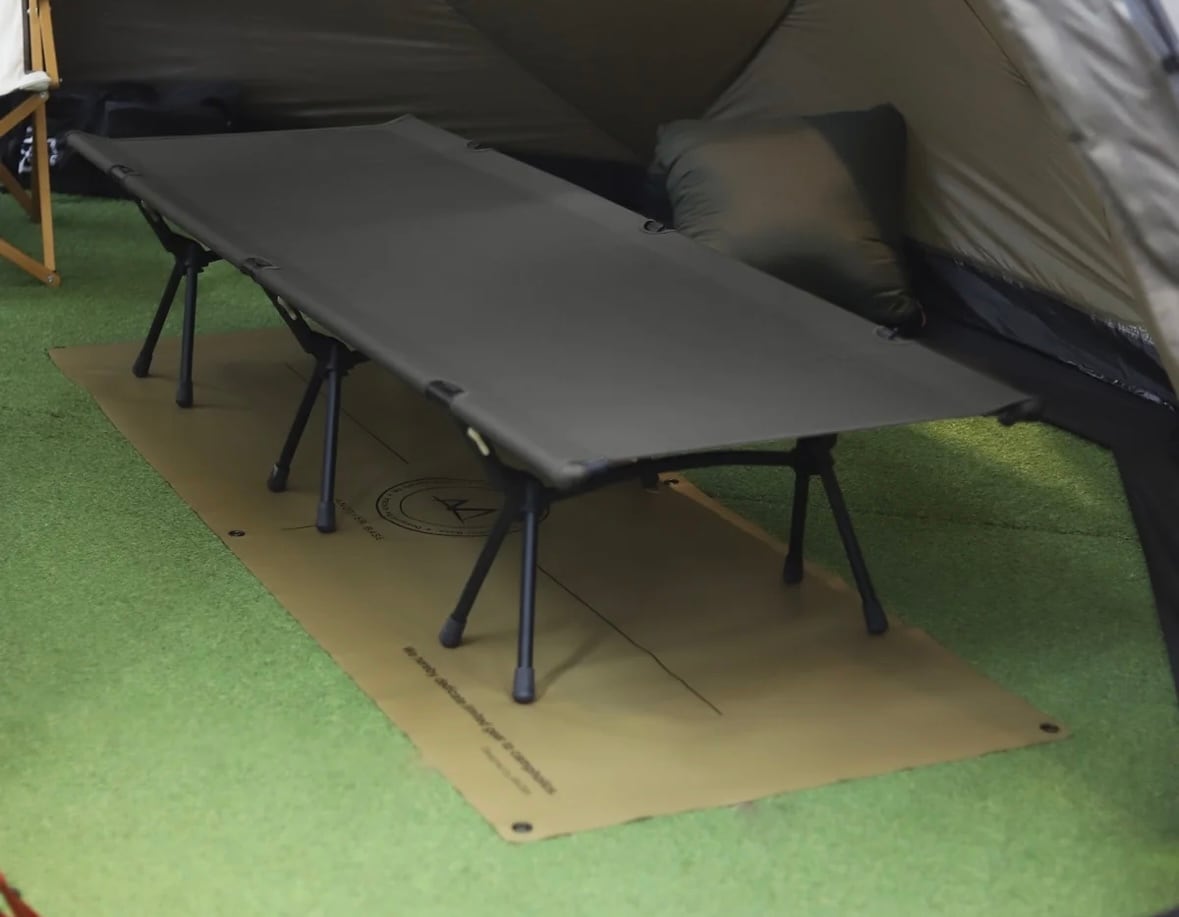 シートの上でコット本体の組み立てられ、撤収時も脚を汚さず収納可能。